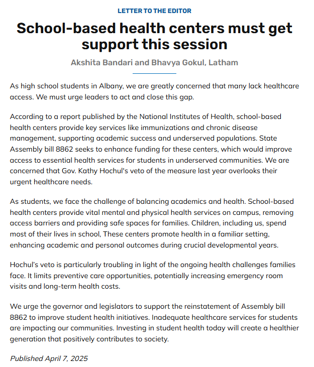 We published an editorial in the Times Union urging support for school-based health centers this session.